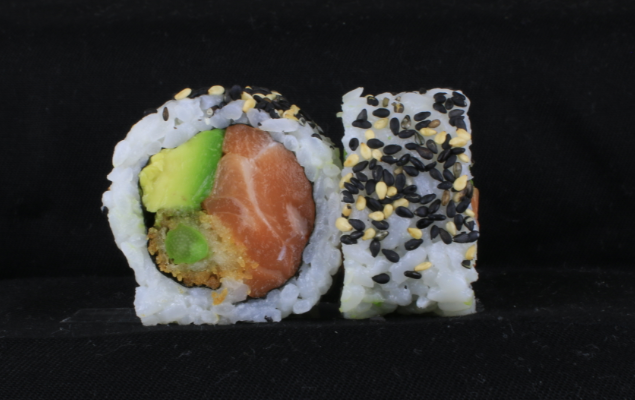 laks,tempura asparges,cream cheese,avocado,agurk rullet i sort/hvid sesam.
