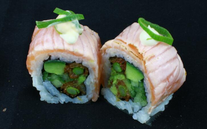 Tempura asparges, med avocado insideout, toppet med flamberet laks og mayo